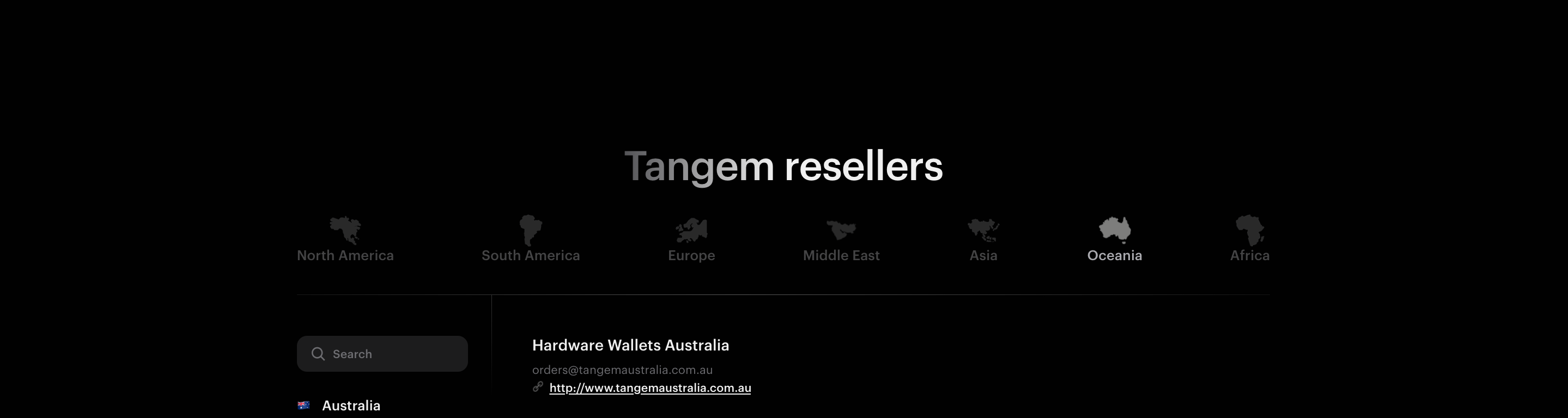 Look for Tangem Australia under “ Tangem's partners, "resellers proven over the years" on the official Tangem.com website, located just above "Tangem resellers" here. You can also find Tangem Australia within Tangem's Oceania resellers.